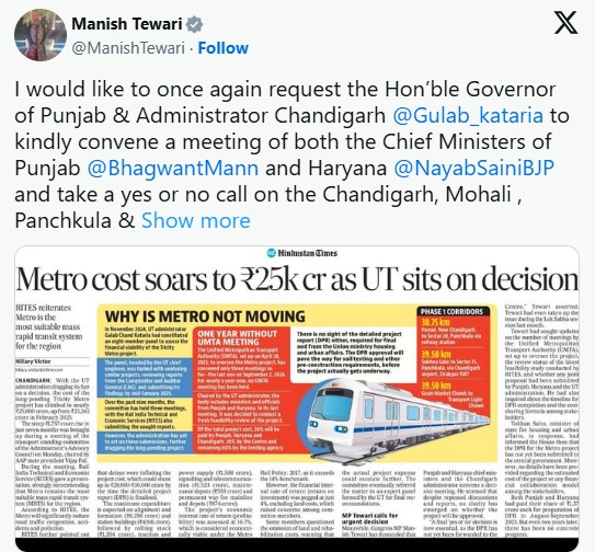 ਉਧਰ, ਚੰਡੀਗੜ੍ਹ ਸੰਸਦ ਮੈਂਬਰ ਮਨੀਸ਼ ਤਿਵਾੜੀ ਨੇ ਆਖਿਆ ਕਿ ਪੰਜਾਬ-ਹਰਿਆਣਾ ਨੂੰ ਇਸ ਪ੍ਰੋਜੈਕਟ ਬਾਰੇ ਛੇਤੀ ਫੈਸਲਾ ਲੈਣਾ ਚਾਹੀਦਾ ਹੈ। ਉਨ੍ਹਾਂ ਨੇ ਇਸ ਸਬੰਧੀ ਟਵੀਟ ਕੀਤਾ ਹੈ ਤੇ ਲਿਖਿਆ ਹੈ- ਮੈਂ ਇੱਕ ਵਾਰ ਫਿਰ ਪੰਜਾਬ ਦੇ ਮਾਣਯੋਗ ਰਾਜਪਾਲ ਅਤੇ ਚੰਡੀਗੜ੍ਹ ਦੇ ਪ੍ਰਸ਼ਾਸਕ ਨੂੰ ਬੇਨਤੀ ਕਰਨਾ ਚਾਹੁੰਦਾ ਹਾਂ ਕਿ ਉਹ ਕਿਰਪਾ ਕਰਕੇ ਪੰਜਾਬ ਅਤੇ ਹਰਿਆਣਾ ਦੇ ਮੁੱਖ ਮੰਤਰੀਆਂ ਦੀ ਮੀਟਿੰਗ ਬੁਲਾਉਣ ਅਤੇ ਚੰਡੀਗੜ੍ਹ, ਮੋਹਾਲੀ, ਪੰਚਕੂਲਾ ਅਤੇ ਨਿਊ ਚੰਡੀਗੜ੍ਹ ਮੈਟਰੋ ਪ੍ਰੋਜੈਕਟ ‘ਤੇ ‘ਹਾਂ’ ਜਾਂ ‘ਨਾਂਹ’ ਬਾਰੇ ਫੈਸਲਾ ਲੈਣ।