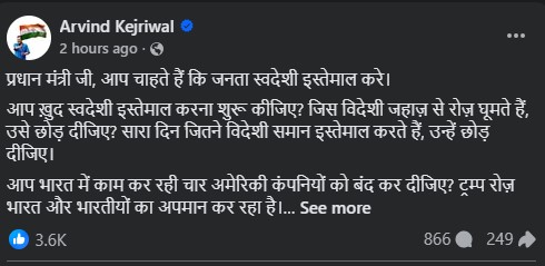ਕੇਜਰੀਵਾਲ ਨੇ ਆਪਣੇ X ਅਕਾਊਂਟ ‘ਤੇ ਲਿਖਿਆ ਕਿ ਪ੍ਰਧਾਨ ਮੰਤਰੀ, ਤੁਸੀਂ ਚਾਹੁੰਦੇ ਹੋ ਕਿ ਜਨਤਾ ਸਵਦੇਸ਼ੀ ਸਾਮਾਨ ਦੀ ਵਰਤੋਂ ਕਰੇ। ਕੇਜਰੀਵਾਲ ਨੇ ਕਿਹਾ, ਕੀ ਤੁਹਾਨੂੰ ਖੁਦ ਸਵਦੇਸ਼ੀ ਸਾਮਾਨ ਦੀ ਵਰਤੋਂ ਸ਼ੁਰੂ ਕਰ ਦੇਣੀ ਚਾਹੀਦੀ ਹੈ? ਉਹ ਵਿਦੇਸ਼ੀ ਜਹਾਜ਼ ਛੱਡ ਦਿਓ ਜਿਸ ਵਿੱਚ ਤੁਸੀਂ ਹਰ ਰੋਜ਼ ਯਾਤਰਾ ਕਰਦੇ ਹੋ? ਸਾਰਾ ਦਿਨ ਵਰਤਦੇ ਸਾਰੇ ਵਿਦੇਸ਼ੀ ਸਾਮਾਨ ਛੱਡ ਦਿਓ।