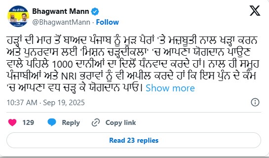 ਮੁੱਖ ਮੰਤਰੀ ਭਗਵੰਤ ਮਾਨ ਨੇ ਟਵੀਟ ਕਰਦਿਆਂ ਲਿਖਿਆ ਕਿ ਹੜ੍ਹਾਂ ਦੀ ਮਾਰ ਤੋਂ ਬਾਅਦ ਪੰਜਾਬ ਨੂੰ ਮੁੜ ਪੈਰਾਂ ‘ਤੇ ਮਜ਼ਬੂਤੀ ਨਾਲ ਖੜ੍ਹਾ ਕਰਨ ਅਤੇ ਪੁਨਰਵਾਸ ਲਈ ‘ਮਿਸ਼ਨ ਚੜ੍ਹਦੀਕਲਾ’ ‘ਚ ਆਪਣਾ ਯੋਗਦਾਨ ਪਾਉਣ ਵਾਲੇ ਪਹਿਲੇ 1000 ਦਾਨੀਆਂ ਦਾ ਦਿਲੋਂ ਧੰਨਵਾਦ ਕਰਦੇ ਹਾਂ। ਨਾਲ ਹੀ ਸਮੂਹ ਪੰਜਾਬੀਆਂ ਅਤੇ NRI ਭਰਾਵਾਂ ਨੂੰ ਵੀ ਅਪੀਲ ਕਰਦੇ ਹਾਂ ਕਿ ਇਸ ਪੁੰਨ ਦੇ ਕੰਮ ‘ਚ ਆਪਣਾ ਵਧ ਚੜ੍ਹ ਕੇ ਯੋਗਦਾਨ ਪਾਓ।