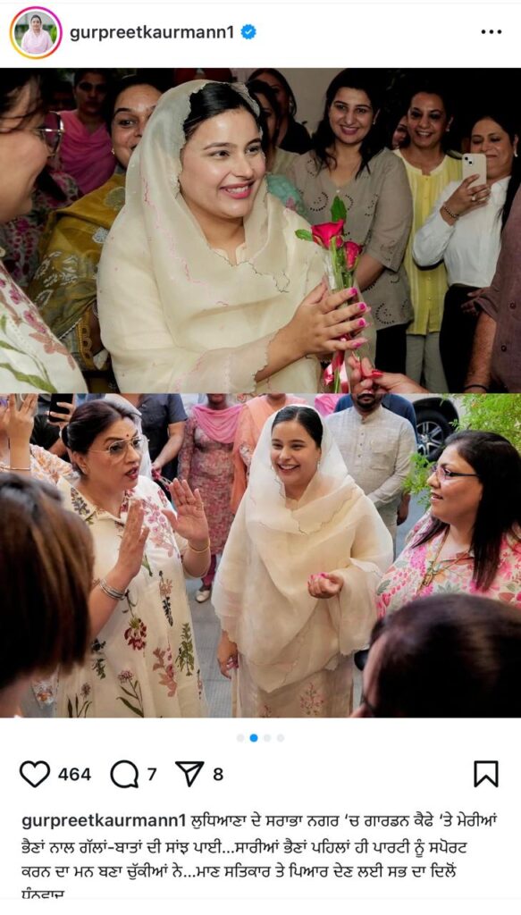 ਲੁਧਿਆਣਾ ਜ਼ਿਮਨੀ ਚੋਣ ਵਿਚ ਪ੍ਰਚਾਰ ਕਰਨ ਉਤਰੀ ਮੁੱਖ ਮੰਤਰੀ ਭਗਵੰਤ ਮਾਨ ਦੀ ਪਤਲੀ ਡਾ ਗੁਰਪ੍ਰੀਤ ਕੌਰ ਨੇ ਪੋਸਟ ਪਾ ਕੇ ਆਖਿਆ ਕਿ, ਲੁਧਿਆਣਾ ਦੇ ਸਰਾਭਾ ਨਗਰ ਵਿੱਚ ਗਾਰਡਨ ਕੈਫੇ ‘ਤੇ ਮੇਰੀਆਂ ਭੈਣਾਂ ਨਾਲ ਗੱਲਾਂ-ਬਾਤਾਂ ਦਾ ਸੁਹਾਵਣਾ ਮਾਹੌਲ ਬਣਿਆ। ਇਸ ਮੁਲਾਕਾਤ ਦੌਰਾਨ ਸਾਰੀਆਂ ਭੈਣਾਂ ਪਹਿਲਾਂ ਹੀ ਪਾਰਟੀ ਨੂੰ ਸਪੋਰਟ ਕਰਨ ਦਾ ਫੈਸਲਾ ਕਰ ਚੁੱਕੀਆਂ ਹਨ। ਮੈਂ ਸਾਰਿਆਂ ਦਾ ਮਾਣ, ਸਤਿਕਾਰ ਅਤੇ ਪਿਆਰ ਦੇਣ ਲਈ ਦਿਲੋਂ ਧੰਨਵਾਦ ਕਰਦੀ ਹਾਂ। ਇਹ ਸਾਂਝ ਪਾਰਟੀ ਦੇ ਵਧਦੇ ਹੌਂਸਲੇ ਅਤੇ ਇੱਕਤਾ ਦਾ ਪ੍ਰਤੀਕ ਹੈ।