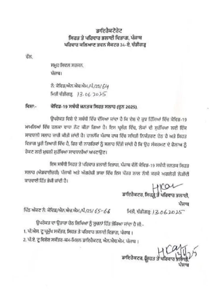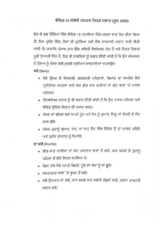 ਇਸ ਦੇ ਮੱਦੇਨਜ਼ਰ ਸਿਹਤ ਤੇ ਪਰਿਵਾਰ ਭਲਾਈ ਵਿਭਾਗ ਪੰਜਾਬ ਨੇ ਲੋਕਾਂ ਦੀ ਸੁਰੱਖਿਆ ਲਈ ਇੱਕ ਸਾਵਧਾਨੀ ਐਡਵਾਇਜ਼ਰੀ ਜਾਰੀ ਕੀਤੀ ਹੈ। ਇਸ ਐਡਵਾਇਜ਼ਰੀ ‘ਚ ਕਿਹਾ ਗਿਆ ਹੈ ਕਿ ਪੰਜਾਬ ਵਿਚ ਸਥਿਤੀ ਕਾਬੂ ਹੇਠ ਹੈ ਤੇ ਸਿਹਤ ਵਿਭਾਗ ਪੂਰੀ ਤਰ੍ਹਾਂ ਤਿਆਰ ਹੈ। ਹਾਲਾਂਕਿ, ਇਸ ਐਡਵਾਇਜ਼ਰੀ ਵਿਚ ਨਾਗਰਿਕਾਂ ਨੂੰ ਸਲਾਹ ਦਿੱਤੀ ਗਈ ਹੈ ਕਿ ਉਹ ਸੰਕਰਮਣ ਦੇ ਫੈਲਾਅ ਨੂੰ ਰੋਕਣ ਲਈ ਮੁਢਲੀ ਸੁਰੱਖਿਆ ਸਾਵਧਾਨੀਆਂ ਦੀ ਪਾਲਣਾ ਕਰਨ।