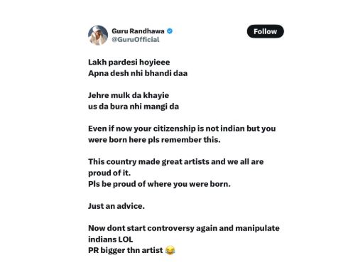 ਗੁਰੂ ਰੰਧਾਵਾ ਨੇ ਆਪਣੇ X (ਟਵਿੱਟਰ) ਹੈਂਡਲ ‘ਤੇ ਬਿਨਾਂ ਕਿਸੇ ਨਾਂ ਲਏ ਲਿਖਿਆ: ” ਲੱਖ ਪਰਦੇਸੀ ਹੋਈਏ, ਆਪਣਾ ਦੇਸ਼ ਨ੍ਹੀ ਭੰਡੀ ਦਾ, ਜਿਹੜੇ ਮੁਲਕ ਦਾ ਖਾਈਏ ਉਸ ਦਾ ਬੁਰਾ ਨ੍ਹੀ ਮੰਗੀ ਦਾ। ਭਾਵੇਂ ਤੁਸੀਂ ਪੂਰੀ ਤਰ੍ਹਾਂ ਵਿਦੇਸ਼ੀ ਹੋ ਜਾਓ, ਪਰ ਤੁਹਾਨੂੰ ਆਪਣੇ ਦੇਸ਼ ਨਾਲ ਕਦੇ ਵੀ ਵਿਸ਼ਵਾਸਘਾਤ ਨਹੀਂ ਕਰਨਾ ਚਾਹੀਦਾ। ਜਿਹੜੇ ਦੇਸ਼ ਤੋਂ ਤੁਹਾਨੂੰ ਸਭ ਕੁਝ ਮਿਲਿਆ, ਉਸ ਲਈ ਬੁਰਾ ਨਹੀਂ ਸੋਚਣਾ ਚਾਹੀਦਾ। ਭਾਵੇਂ ਹੁਣ ਤੁਹਾਡੀ ਨਾਗਰਿਕਤਾ ਭਾਰਤੀ ਨਾ ਹੋਵੇ, ਪਰ ਤੁਸੀਂ ਇੱਥੇ ਹੀ ਜੰਮੇ ਹੋ, ਇਹ ਕਦੇ ਨਾ ਭੁੱਲੋ। ਇਹ ਦੇਸ਼ ਮਹਾਨ ਕਲਾਕਾਰਾਂ ਦੀ ਜਨਮਭੂਮੀ ਹੈ, ਜਿਸ ‘ਤੇ ਸਾਨੂੰ ਮਾਣ ਹੈ। ਕਿਰਪਾ ਕਰਕੇ ਉਸ ਜਗ੍ਹਾ ‘ਤੇ ਮਾਣ ਕਰੋ ਜਿੱਥੇ ਤੁਸੀਂ ਪੈਦਾ ਹੋਏ ਸੀ। ਸਿਰਫ਼ ਇੱਕ ਸਲਾਹ ਹੈ। ਹੁਣ ਫਿਰ ਤੋਂ ਕੋਈ ਵਿਵਾਦ ਸ਼ੁਰੂ ਨਾ ਕਰੋ ਅਤੇ ਭਾਰਤੀਆਂ ਨੂੰ ਭਟਕਾਉਣਾ ਵੀ ਬੰਦ ਕਰੋ। PR ਆਰਟਿਸਟ ਤੋਂ ਵੱਡਾ ਹੋ ਗਿਆ ਹੈ।”