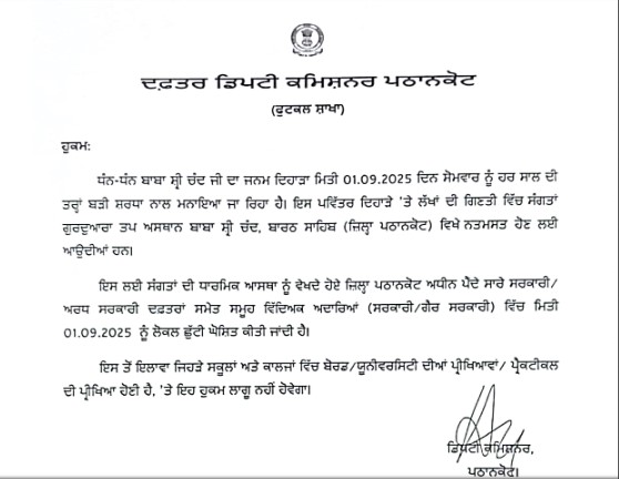 ਸ੍ਰੀ ਗੁਰੂ ਨਾਨਕ ਦੇਵ ਜੀ ਦੇ ਵੱਡੇ ਸਪੁੱਤਰ ਬਾਬਾ ਸ੍ਰੀ ਚੰਦ ਜੀ ਮਹਾਰਾਜ ਦਾ 531ਵਾਂ ਪ੍ਰਕਾਸ਼ ਪੁਰਬ ਸੋਮਵਾਰ, 1 ਸਤੰਬਰ ਨੂੰ ਮਨਾਇਆ ਜਾ ਰਿਹਾ ਹੈ। ਜਿਸ ਨੂੰ ਲੈ ਕੇ ਜ਼ਿਲ੍ਹਾ ਪਠਾਨਕੋਟ ਪ੍ਰਸ਼ਾਸਨ ਵੱਲੋਂ ਲੋਕਲ ਛੁੱਟੀ ਦਾ ਐਲਾਨ ਕੀਤਾ ਗਿਆ ਹੈ। ਇਸ ਲਈ ਸੋਮਵਾਰ ਨੂੰ ਜ਼ਿਲ੍ਹਾ ਪਠਾਨਕੋਟ ਦੇ ਸਰਕਾਰੀ- ਅਰਧ ਸਰਕਾਰੀ ਦਫਤਰਾਂ ਅਤੇ ਸਮੂਹ ਵਿਦਿਅਕ ਅਦਾਰਿਆਂ ਵਿੱਚ ਛੁੱਟੀ ਐਲਾਨੀ ਗਈ ਹੈ। ਡਿਪਟੀ ਕਮਿਸ਼ਨਰ ਪਠਾਨਕੋਟ ਵੱਲੋਂ ਇਸ ਸਬੰਧੀ ਨੋਟੀਫਿਕੇਸ਼ਨ ਵੀ ਜਾਰੀ ਕੀਤਾ ਗਿਆ ਹੈ।