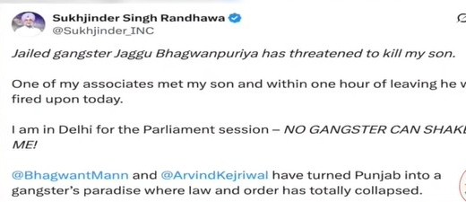 ਪੰਜਾਬ ਦੇ ਸਾਬਕਾ ਉਪ ਮੁੱਖ ਮੰਤਰੀ ਅਤੇ ਗੁਰਦਾਸਪੁਰ ਤੋਂ ਕਾਂਗਰਸ ਪਾਰਟੀ ਦੇ ਮੈਂਬਰ ਪਾਰਲੀਮੈਂਟ ਸੁਖਜਿੰਦਰ ਸਿੰਘ ਰੰਧਾਵਾ ਵੱਲੋਂ ਆਪਣੇ ਐਕਸ ਹੈਂਡਲ ਤੇ ਇੱਕ ਪੋਸਟ ਸਾਂਝੀ ਕੀਤੀ ਹੈ ਜਿਸ ਵਿੱਚ ਉਹਨਾਂ ਨੇ ਲਿਖਿਆ ਹੈ ਕਿ ਉਹਨਾਂ ਦੇ ਬੇਟੇ ਉਦੇਵੀਰ ਸਿੰਘ ਰੰਧਾਵਾ ਨੂੰ ਜੇਲ ਵਿੱਚ ਬੰਦ ਗੈਂਗਸਟਰ ਜੱਗੂ ਭਗਵਾਨਪੁਰੀਆ ਵੱਲੋਂ ਜਾਨੋ ਮਾਰਨ ਦੀ ਧਮਕੀ ਦਿੱਤੀ ਗਈ ਹੈ ਉਹਨਾਂ ਨੇ ਲਿਖਿਆ ਕਿ ਬੀਤੇ ਕੱਲ ਉਹਨਾਂ ਦਾ ਇੱਕ ਸਾਥੀ ਉਹਨਾਂ ਦੇ ਪੁੱਤਰ ਨੂੰ ਮਿਲਿਆ ਸੀ ਅਤੇ ਜਾਣ ਤੋਂ ਇਕ ਘੰਟੇ ਦੇ ਅੰਦਰ ਅੰਦਰ ਉਸਦੇ ਉੱਪਰ ਗੋਲੀ ਚਲਾ ਦਿੱਤੀ ਗਈ ਉਹਨਾਂ ਕਿਹਾ ਕਿ ਮੈਂ ਸੰਸਦ ਸੈਸ਼ਨ ਲਈ ਦਿੱਲੀ ਵਿੱਚ ਹਾਂ ਕੋਈ ਵੀ ਗੈਂਗਸਟਰ ਮੈਨੂੰ ਹਿਲਾ ਨਹੀਂ ਸਕਦਾ
