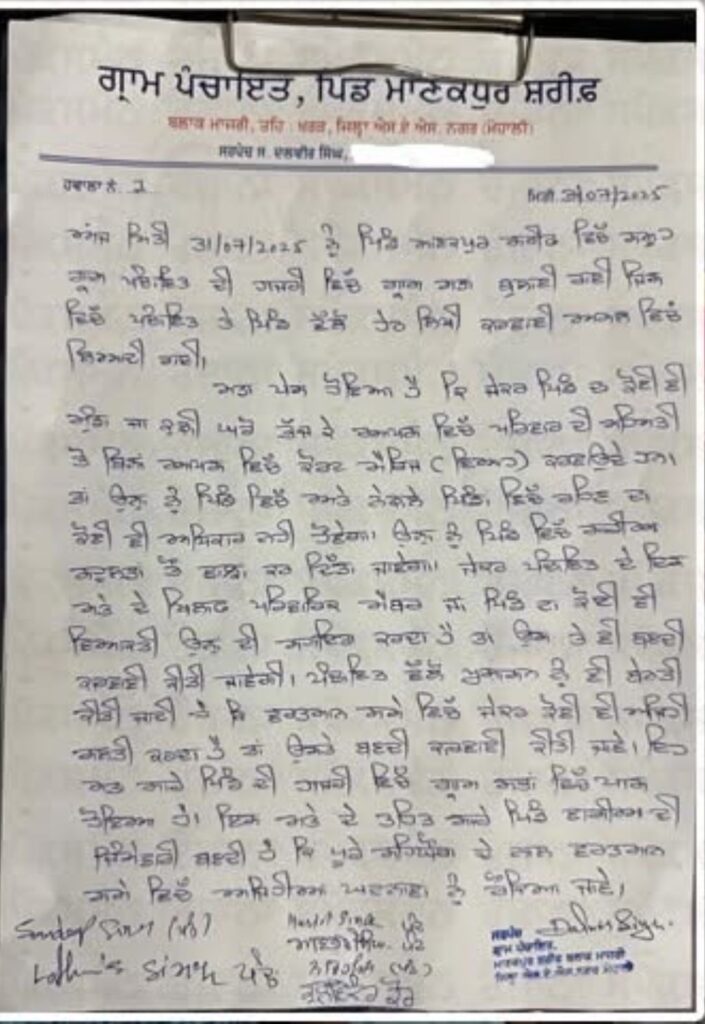ਜ਼ਿਲ੍ਹੇ ਦੇ ਪਿੰਡ ਮਾਣਕਪੁਰ ਸ਼ਰੀਫ਼ ਦੀ ਪੰਚਾਇਤ ਨੇ ਇੱਕ ਨੌਜਵਾਨ ਜੋੜੇ ਵੱਲੋਂ ਪਰਿਵਾਰ ਦੀ ਮਰਜ਼ੀ ਦੇ ਖ਼ਿਲਾਫ਼ ਘਰੋਂ ਭੱਜ ਕੇ ਵਿਆਹ ਕਰਵਾਉਣ ਦੇ ਮਾਮਲੇ ਵਿੱਚ ਇੱਕ ਮਤਾ ਪਾਸ ਕੀਤਾ ਹੈ। ਇਸ ਮਤੇ ਵਿੱਚ ਫੈਸਲਾ ਲਿਆ ਗਿਆ ਹੈ ਕਿ ਇਸ ਜੋੜੇ ਨੂੰ ਪਿੰਡ ਅਤੇ ਆਸ-ਪਾਸ ਦੇ ਇਲਾਕੇ ਵਿੱਚ ਰਹਿਣ ਦਾ ਕੋਈ ਅਧਿਕਾਰ ਨਹੀਂ ਹੋਵੇਗਾ।