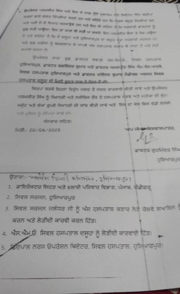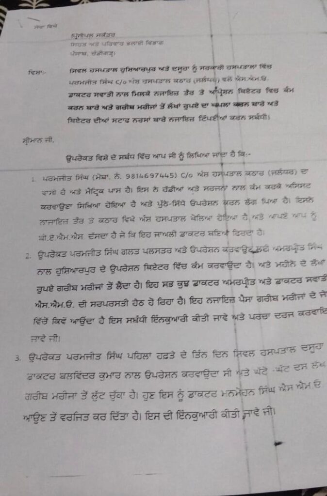 ਸਿਵਲ ਹਸਪਤਾਲ ਹੁਸ਼ਿਆਰਪੁਰ ਅਤੇ ਦਸੂਹਾ ਵਰਗੇ ਸਰਕਾਰੀ ਹਸਪਤਾਲਾਂ ਵਿੱਚ ਉੱਚ ਸਿਹਤ ਅਧਿਕਾਰੀਆਂ ਦੀ ਕਥਿਤ ਮਿਲੀਭੁਗਤ ਨਾਲ ਮੈਟ੍ਰਿਕ ਪਾਸ ਇੱਕ ਵਿਅਕਤੀ ਵੱਲੋਂ ਲੋਕਾਂ ਦੇ ਇਲਾਜ ਤੇ ਅਪ੍ਰੇਸ਼ਨ ਦੇ ਬਹਾਨੇ ਲੱਖਾਂ ਰੁਪਏ ਬਟੋਰਨ ਦੀ ਖ਼ਬਰ ਮਿਲੀ ਹੈ, ਇਨ੍ਹਾਂ ਹੀ ਨਹੀਂ ਸਗੋਂ ਮੈਟ੍ਰਿਕ ਪਾਸ ਦੱਸੇ ਜਾਂਦੇ ਉਕਤ ਵਿਅਕਤੀ ਵੱਲੋਂ ਹੁਸ਼ਿਆਰਪੁਰ ਜਲੰਧਰ ਰੋਡ ‘ਤੇ ਅੱਡਾ ਕੱਠਾਰ ਵਿਖ਼ੇ ਇੱਕ ਹਸਪਤਾਲ ਖੋਲ੍ਹ ਕੇ ਅਣ ਅਧਿਕਾਰਿਤ ਤਰੀਕੇ ਨਾਲ ਇਲਾਜ ਦੇ ਨਾਮ ‘ ਤੇ ਮਰੀਜ਼ਾਂ ਦਾ ਨਿਧੜਕ ਹੋ ਕੇ ਸ਼ੋਸ਼ਣ ਕੀਤਾ ਜਾ ਰਿਹਾ ਹੈ | ਇਸ ਸਾਰੇ ਮਾਮਲੇ ਨੂੰ ਸ਼ਿਕਾਇਤ ਦੇ ਰੂਪ ਵਿੱਚ ਪ੍ਰਿੰਸੀਪਲ ਸਕੱਤਰ ਸਿਹਤ ਅਤੇ ਪਰਿਵਾਰ ਭਲਾਈ ਵਿਭਾਗ ਪੰਜਾਬ ਨੂੰ ਡਾ. ਗੁਰਮਿੰਦਰ ਸਿੰਘ ਦੇ ਨਾਮ ‘ਤੇ ਲਿਖੇ ਅਤੇ ਮੀਡੀਆ ਨੂੰ ਪ੍ਰਾਪਤ ਹੋਏ ਇੱਕ ਪੱਤਰ ਰਾਹੀਂ ਉਜਾਗਰ ਕਰਦਿਆਂ ਦੱਸਿਆ ਗਿਆ ਹੈ ਕਿ ਮੈਟ੍ਰਿਕ ਪਾਸ ਦੱਸੇ ਜਾਂਦੇ ਪਰਮਜੀਤ ਸਿੰਘ ਵੱਲੋਂ ਸਿਵਲ ਹਸਪਤਾਲ ਹੁਸ਼ਿਆਰਪੁਰ ਦੀ ਇੰਚਾਰਜ ਮਹਿਲਾ ਐੱਸਐੱਮਓ ਨਾਲ ਕਥਿਤ ਰੂਪ ਵਿੱਚ ਮਿਲੀਭੁਗਤ ਕਰਕੇ ਨਜਾਇਜ਼ ਤੌਰ ਤੇ ਅਪ੍ਰੇਸ਼ਨ ਥਿਏਟਰ ਵਿਚ ਕੰਮ ਕਰਨ ਅਤੇ ਗਰੀਬ ਮਰੀਜਾਂ ਤੋਂ ਵੱਡੀਆਂ ਰਕਮਾਂ ਬਟੋਰਨ ਅਤੇ ਥਿਏਟਰ ਦੀਆਂ ਸਟਾਫ ਨਰਸਾਂ ਬਾਰੇ ਗਲਤ ਅਤੇ ਨਜਾਇਜ਼ ਟਿੱਪਣੀਆਂ ਕਰਨ ਦਾ ਜ਼ਿਕਰ ਕੀਤਾ ਗਿਆ ਹੈ | ਮੀਡੀਆ ਦੇ ਹੱਥ ਲੱਗੇ ਉਕਤ ਸ਼ਿਕਾਇਤ ਪੱਤਰ ਅਨੁਸਾਰ ਪਰਮਜੀਤ ਸਿੰਘ ਅੰਸ਼ ਹਸਪਤਾਲ ਕਠਾਰ ਜ਼ਿਲ੍ਹਾ ਜਲੰਧਰ ਵਾਸੀ ਹੈ ਅਤੇ ਮੈਟ੍ਰਿਕ ਪਾਸ ਹੈ। ਇਸ ਨੇ ਹੱਡੀਆਂ ਦੇ ਮਾਹਿਰ ਡਾਕਟਰਾਂ ਅਤੇ ਸਰਜਨਾਂ ਨਾਲ ਕੰਮ ਕਰਕੇ ਅਪ੍ਰੇਸ਼ਨਾਂ ਦੌਰਾਨ ਡਾਕਟਰਾਂ ਨੂੰ ਅਸਿਸਟ ਕਰਨਾ ਸਿਖਿਆ ਹੋਇਆ ਹੈ ਅਤੇ ਇਸ ਦਾ ਹੋਂਸਲਾ ਹੁਣ ਇਨ੍ਹਾਂ ਵੱਧ ਗਿਆ ਹੈ ਕਿ ਖੁਦ ਹੀ ਪੁੱਠੇ-ਸਿੱਧੇ ਉਪਰੇਸ਼ਨ ਕਰਨ ਲੱਗ ਪਿਆ ਹੈ। ਜਿਸ ਲਈ ਇਸ ਨੇ ਨਾਜਾਇਜ਼ ਤੌਰ ਤੇ ਕਠਾਰ ਵਿਖੇ ਅੰਸ਼ ਹਸਪਤਾਲ ਖੋਲਿਆ ਹੋਇਆ ਹੈ ਅਤੇ ਆਪਣੇ ਆਪ ਨੂੰ ਬੀਏਐਮਐਸ ਦੱਸਦਾ ਹੈ ਜੇ ਕਿ ਇਹ ਜਾਅਲੀ ਡਾਕਟਰ ਬਣਿਆ ਫਿਰਦਾ ਹੈ। ਉਪਰੋਕਤ ਪਰਮਜੀਤ ਸਿੰਘ ਗਲਤ ਪਲਸਤਰ ਅਤੇ ਓਪਰੇਸ਼ਨ ਕਰਵਾਉਣ ਲਈ ਅਮਰਪ੍ਰੀਤ ਸਿੰਘ ਨਾਲ ਹੁਸ਼ਿਆਰਪੁਰ ਦੇ ਉਪਰੇਸ਼ਨ ਥਿਏਟਰ ਵਿੱਚ ਕੰਮ ਕਰਵਾਉਂਦਾ ਹੈ ਅਤੇ ਮਹੀਨੇ ਦੇ ਲੱਖਾਂ ਰੁਪਏ ਗਰੀਬ ਮਰੀਜਾਂ ਤੋਂ ਬਟੋਰ ਲੈਂਦਾ ਹੈ। ਇਹ ਸਭ ਕੁਝ ਡਾਕਟਰ ਅਮਰਪ੍ਰੀਤ ਸਿੰਘ ਅਤੇ ਡਾਕਟਰ ਸਵਾਤੀ ਐਸਐਮਓ ਦੀ ਕਥਿਤ ਸਰਪ੍ਰਸਤੀ ਹੇਠ ਹੋ ਰਿਹਾ ਹੈ। ਇਹ ਨਜਾਇਜ਼ ਪੈਸਾ ਗਰੀਬ ਮਰੀਜਾਂ ਕੋਲੋਂ ਕਿਵੇਂ ਬਟੋਰਿਆ ਜਾਂਦਾ ਹੈ ਇਸ ਸਬੰਧੀ ਇੰਨਕੁਆਰੀ ਕੀਤੀ ਜਾਵੇ ਅਤੇ ਬਣਦੀਆਂ ਧਾਰਾਵਾਂ ਅਧੀਨ ਪਰਚਾ ਦਰਜ ਕਰਵਾਇਆ ਜਾਵੇ | ਦੱਸਿਆ ਜਾਂਦਾ ਹੈ ਕਿ ਉਪਰੋਕਤ ਪਰਮਜੀਤ ਸਿੰਘ ਪਹਿਲਾਂ ਹਫ਼ਤੇ ਦੇ ਤਿੰਨ ਦਿਨ ਸਿਵਲ ਹਸਪਤਾਲ ਦਸੂਹਾ ਡਾਕਟਰ ਬਲਵਿੰਦਰ ਕੁਮਾਰ ਨਾਲ ਓਪਰੇਸ਼ਨ ਕਰਵਾਉਂਦਾ ਸੀ ਅਤੇ ਘੱਟੋ-ਘੱਟ ਦਸ ਲੱਖ ਗਰੀਬ ਮਰੀਜ਼ਾਂ ਤੋਂ ਬਟੋਰ ਚੁੱਕਾ ਹੈ। ਹੁਣ ਇਸ ਨੂੰ ਡਾਕਟਰ ਮਨਮੋਹਨ ਸਿੰਘ ਐਸ.ਐਮ.ਓ. ਵੱਲੋਂ ਆਪਣੀ ਡਿਊਟੀ ਜੁਆਇੰਨ ਕਰਨ ਉਪਰੰਤ ਦਸੂਹਾ ਹਸਪਤਾਲ ਆਉਣ ਤੋਂ ਵਰਜ ਦਿੱਤਾ ਗਿਆ ਹੈ। ਸਿਵਲ ਹਸਪਤਾਲ ਹੁਸ਼ਿਆਰਪੁਰ ਦੀ ਇੰਚਾਰਜ ਐੱਸਐੱਮਓ ਡਾ ਸਵਾਤੀ, ਹੱਡੀਆਂ ਦੇ ਮਾਹਿਰ ਡਾ ਅਮਰਪ੍ਰੀਤ ਸਿੰਘ ਸਿਵਲ ਹਸਪਤਾਲ ਹੁਸ਼ਿਆਰਪੁਰ ਅਤੇ ਡਾਕਟਰ ਦਵਿੰਦਰ ਕੁਮਾਰ ਮੈਡੀਕਲ ਅਫਸਰ, ਸਿਵਲ ਹਸਪਤਾਲ ਦਸੂਹਾ ਦੀ ਮਿਲੀ ਭੁਗਤ ਨਾਲ ਸਾਰਾ ਘਾਲਾ ਮਾਲਾ ਹੋ ਰਿਹਾ ਹੈ | ਸ਼ਿਕਾਇਤ ਵਿੱਚ ਲਿਖਿਆ ਗਿਆ ਹੈ ਕਿ ਨਿਰਪੱਖ ਏਜੰਸੀਆਂ ਵੱਲੋਂ ਇਸ ਮਾਮਲੇ ਦੀ ਜਾਂਚ ਕਰਨ ‘ਤੇ ਵੱਡੇ ਖੁਲਾਸੇ ਹੋ ਸਕਦੇ ਹਨ 