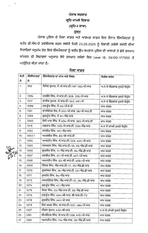 ਕੁਝ ਅਧਿਕਾਰੀਆਂ ਨੂੰ ਸੀਨੀਆਰਤਾ ਅਨੁਸਾਰ ਡੀਐਸਪੀ ਦੇ ਅਹੁਦੇ ‘ਤੇ ਨਿਯੁਕਤੀ ਲਈ ਯੋਗਤਾ” ਦੇ ਆਧਾਰ ‘ਤੇ ਪ੍ਰਮੋਸ਼ਨ ਦਿੱਤਾ ਗਿਆ ਹੈ, ਜੋ ਯੋਗ ਸਨ ਪਰ ਸੀਟ ਉਪਲਬਧ ਹੋਣ ‘ਤੇ ਉਨ੍ਹਾਂ ਨੂੰ ਤਰੱਕੀ ਦਿੱਤੀ ਗਈ ਸੀ।ਹੁਕਮਾਂ ਵਿੱਚ ਇਹ ਸਪੱਸ਼ਟ ਕੀਤਾ ਗਿਆ ਹੈ ਕਿ ਪ੍ਰਮੋਸ਼ਨ ਨੂੰ ਨਿਯਮਤ ਨਿਯੁਕਤੀਆਂ ਵਾਂਗ ਹੀ ਪ੍ਰਭਾਵੀ ਮੰਨਿਆ ਜਾਵੇਗਾ।