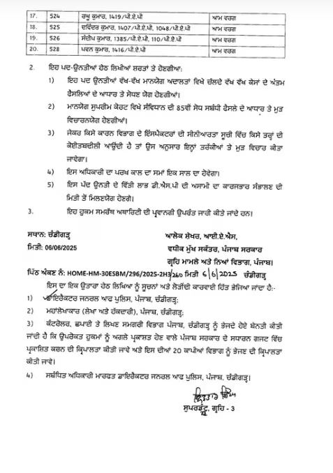 ਸਬੰਧਤ ਪੁਲਿਸ ਦਫ਼ਤਰਾਂ ਨੂੰ ਇੱਕ ਹਫ਼ਤੇ ਦੇ ਅੰਦਰ ਤਰੱਕੀ ਆਦੇਸ਼ਾਂ ਨੂੰ ਲਾਗੂ ਕਰਨ ਦੀ ਰਿਪੋਰਟ ਭੇਜਣ ਦੇ ਨਿਰਦੇਸ਼ ਦਿੱਤੇ ਗਏ ਹਨ।