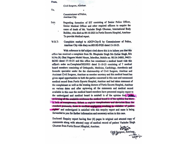 ਜਲੰਧਰ, 4 ਮਾਰਚ (ਨਿਊਜ਼ ਟਾਊਨ ਨੈਟਵਰਕ) : ਪੰਜਾਬ ਦੇ ਜਲੰਧਰ ਦੇ ਰਹਿਣ ਵਾਲੇ ਮਸ਼ਹੂਰ ਬਾਡੀ ਬਿਲਡਰ ਵਰਿੰਦਰ ਸਿੰਘ ਘੁੰਮਣ ਦੀ 9 ਅਕਤੂਬਰ ਨੂੰ ਅੰਮ੍ਰਿਤਸਰ ਦੇ ਫੋਰਟਿਸ ਹਸਪਤਾਲ ਵਿਚ ਇਕ ਆਪ੍ਰੇਸ਼ਨ ਦੌਰਾਨ ਮੌਤ ਹੋ ਗਈ ਸੀ। ਹਸਪਤਾਲ ਨੇ ਇਕ ਬੁਲੇਟਿਨ ਜਾਰੀ ਕੀਤਾ ਸੀ, ਜਿਸ ਵਿਚ ਕਿਹਾ ਗਿਆ ਸੀ ਕਿ ਉਨ੍ਹਾਂ ਦੀ ਮੌਤ ਦਿਲ ਦਾ ਦੌਰਾ ਪੈਣ ਕਾਰਨ ਹੋਈ। ਹਾਲਾਂਕਿ ਪਰਿਵਾਰ ਨੇ ਅੰਮ੍ਰਿਤਸਰ ਦੇ ਡੀ.ਸੀ. ਕੋਲ ਸ਼ਿਕਾਇਤ ਦਰਜ ਕਰਵਾਈ ਸੀ, ਜਿਸ ਵਿਚ ਮਾਮਲੇ ਦੀ ਜਾਂਚ ਦੀ ਬੇਨਤੀ ਕੀਤੀ ਗਈ ਸੀ ਅਤੇ ਡੀ.ਸੀ. ਨੇ ਇਕ ਮੈਡੀਕਲ ਅਫਸਰ ਅਤੇ ਡਾਕਟਰਾਂ ਦੇ ਪੈਨਲ ਨੂੰ ਮਾਮਲੇ ਦੀ ਜਾਂਚ ਕਰਨ ਦਾ ਆਦੇਸ਼ ਦਿੱਤਾ ਸੀ। 7 ਡਾਕਟਰਾਂ ਦੇ ਪੈਨਲ ਦੀ ਰਿਪੋਰਟ ਹੁਣ ਜਾਰੀ ਕੀਤੀ ਗਈ ਹੈ, ਜਿਸ ਵਿਚ ਹਸਪਤਾਲ ਪ੍ਰਬੰਧਨ ਅਤੇ ਡਾਕਟਰਾਂ ਦੀ ਲਾਪਰਵਾਹੀ ਕਾਰਨ ਵਰਿੰਦਰ ਸਿੰਘ ਘੁੰਮਣ ਦੀ ਮੌਤ ਬਾਰੇ ਸੱਚਾਈ ਸਾਹਮਣੇ ਆਈ ਹੈ। ਵਰਿੰਦਰ ਸਿੰਘ ਘੁੰਮਣ ਦੇ ਚਚੇਰੇ ਭਰਾ ਅਤੇ ਦੋਸਤਾਂ ਨੇ ਕਿਹਾ ਹੈ ਕਿ ਰਿਪੋਰਟ ਤੋਂ ਪਤਾ ਲੱਗਾ ਹੈ ਕਿ ਉਨ੍ਹਾਂ ਦੀ ਈਸੀਜੀ ਪਹਿਲਾਂ ਫੋਰਟਿਸ ਹਸਪਤਾਲ ਦੇ ਡਾਕਟਰ ਨੇ ਕੀਤੀ ਸੀ, ਜਿਸ ਵਿਚ ਈਸੀਜੀ ਰਿਪੋਰਟ ਸਹੀ ਨਹੀਂ ਸੀ ਅਤੇ ਬਾਅਦ ਵਿਚ ਉਨ੍ਹਾਂ ਦਾ ਆਪ੍ਰੇਸ਼ਨ ਕੀਤਾ ਗਿਆ, ਜਿਸ ਕਾਰਨ ਵਰਿੰਦਰ ਸਿੰਘ ਘੁੰਮਣ ਦੀ ਮੌਤ ਹੋ ਗਈ। ਉਨ੍ਹਾਂ ਦਾ ਦੋਸ਼ ਹੈ ਕਿ ਹਸਪਤਾਲ ਦੇ ਪ੍ਰਬੰਧਨ ਅਤੇ ਡਾਕਟਰਾਂ ਨੇ ਸਾਰੇ ਸਬੂਤ ਨਸ਼ਟ ਕਰਨ ਦੀ ਕੋਸ਼ਿਸ਼ ਕੀਤੀ ਪਰ ਪ੍ਰਸ਼ਾਸਨ ਦੀ ਡਾਕਟਰਾਂ ਦੀ ਕਮੇਟੀ ਨੇ ਸਹੀ ਜਾਂਚ ਕਰਕੇ ਹਸਪਤਾਲ ਨੂੰ ਬੇਨਕਾਬ ਕਰ ਦਿੱਤਾ ਹੈ। ਵਰਿੰਦਰ ਸਿੰਘ ਘੁੰਮਣ ਦੇ ਚਚੇਰੇ ਭਰਾ ਰਵੀ ਬਾਜਵਾ ਨੇ ਕਿਹਾ ਕਿ ਡਾਕਟਰਾਂ ਦੀ 7 ਮੈਂਬਰੀ ਕਮੇਟੀ ਨੇ ਪੂਰੀ ਇਮਾਨਦਾਰੀ ਨਾਲ ਰਿਪੋਰਟ ਤਿਆਰ ਕੀਤੀ ਹੈ ਅਤੇ ਇਸਨੂੰ ਅੰਮ੍ਰਿਤਸਰ ਦੇ ਡੀਸੀ ਅਤੇ ਪੁਲਿਸ ਕਮਿਸ਼ਨਰ ਅਤੇ ਐਸਆਈਟੀ ਨੂੰ ਭੇਜ ਦਿੱਤਾ ਗਿਆ ਹੈ। ਰਿਪੋਰਟ ਵਿਚ ਸਪੱਸ਼ਟ ਤੌਰ ‘ਤੇ ਕਿਹਾ ਗਿਆ ਹੈ ਕਿ ਬਹੁਤ ਸਾਰੀਆਂ ਕਮੀਆਂ ਹਨ ਅਤੇ ਵਰਿੰਦਰ ਸਿੰਘ ਘੁੰਮਣ ਦੀ ਈਸੀਜੀ ਸਹੀ ਨਹੀਂ ਸੀ ਅਤੇ ਇਸਦਾ ਸਹੀ ਢੰਗ ਨਾਲ ਨਿਰੀਖਣ ਜਾਂ ਜਾਂਚ ਨਹੀਂ ਕੀਤੀ ਗਈ ਸੀ। ਈਸੀਜੀ ਰਿਪੋਰਟ ਤੋਂ ਪਤਾ ਲੱਗਦਾ ਹੈ ਕਿ ਘੁੰਮਣ ਨੂੰ ਐਨੱਸਥੀਸੀਆ ਨਹੀਂ ਦਿੱਤਾ ਜਾਣਾ ਚਾਹੀਦਾ ਸੀ, ਜੋ ਡਾਕਟਰਾਂ ਨੇ ਆਪ੍ਰੇਸ਼ਨ ਤੋਂ ਪਹਿਲਾਂ ਦਿੱਤਾ ਸੀ। ਉਨ੍ਹਾਂ ਕਿਹਾ ਕਿ ਸਾਨੂੰ ਸੂਚਿਤ ਨਹੀਂ ਕੀਤਾ ਗਿਆ ਸੀ ਕਿ ਆਪ੍ਰੇਸ਼ਨ ਵਿਚ ਇੰਨਾ ਸਮਾਂ ਲੱਗੇਗਾ। ਹੁਣ ਸਾਡੇ ਕੋਲ ਪੂਰੇ ਮਾਮਲੇ ਦੀ ਰਿਪੋਰਟ ਹੈ। ਉਨ੍ਹਾਂ ਅੱਗੇ ਕਿਹਾ ਕਿ ਹਸਪਤਾਲ ਵਲੋਂ ਬੁਲੇਟਿਨ ਜਾਰੀ ਕੀਤਾ ਗਿਆ ਸੀ ਅਤੇ ਸਾਨੂੰ ਇਹ ਵੀ ਦੱਸਿਆ ਗਿਆ ਸੀ ਕਿ ਐਥਲੀਟਾਂ ਨੂੰ ਅਜਿਹੀਆਂ ਸਮੱਸਿਆਵਾਂ ਦਾ ਸਾਹਮਣਾ ਕਰਨਾ ਪੈ ਸਕਦਾ ਹੈ, ਪਰ ਅਸੀਂ ਵਿਸ਼ਵਾਸ ਨਹੀਂ ਕਰ ਸਕਦੇ ਸੀ ਕਿ ਵਰਿੰਦਰ ਸਿੰਘ ਘੁੰਮਣ ਦੀ ਮੌਤ ਹੋ ਗਈ ਹੈ। ਹਸਪਤਾਲ ਨੇ ਸਾਨੂੰ ਘੁੰਮਣ ਦੀ ਲਾਸ਼ ਲੈ ਕੇ ਸਸਕਾਰ ਕਰਨ ਲਈ ਕਿਹਾ ਸੀ ਪਰ ਅੱਜ ਸਾਡੇ ਭਰਾਵਾਂ ਦੁਆਰਾ ਵਾਰ-ਵਾਰ ਉਠਾਏ ਗਏ ਸਵਾਲਾਂ ਦੇ ਜਵਾਬ ਮਿਲ ਗਏ ਹਨ। ਰਵੀ ਬਾਜਵਾ ਨੇ ਕਿਹਾ ਕਿ ਈਸੀਜੀ 6 ਤਰੀਕ ਨੂੰ ਕੀਤੀ ਗਈ ਸੀ ਅਤੇ ਰਿਪੋਰਟ ਸਹੀ ਨਹੀਂ ਸੀ। ਅਸੀਂ ਆਪਣੇ ਡਾਕਟਰ ਨਾਲ ਵੀ ਗੱਲ ਕੀਤੀ, ਜਿਸ ਨੇ ਇਹ ਵੀ ਕਿਹਾ ਕਿ ਕੋਈ ਵੀ ਅਜਿਹਾ ਆਪ੍ਰੇਸ਼ਨ ਕਿਵੇਂ ਕਰ ਸਕਦਾ ਹੈ ਕਿਉਂਕਿ ਈਸੀਜੀ ਰਿਪੋਰਟ ਸਹੀ ਨਹੀਂ ਸੀ। ਆਪ੍ਰੇਸ਼ਨ ਦੌਰਾਨ ਉਸਨੂੰ ਓਵਰਡੋਜ਼ ਦਿੱਤੀ ਗਈ, ਜਿਸ ਨਾਲ ਘੁੰਮਣ ਦੀ ਸਿਹਤ ਵਿਗੜ ਗਈ। ਉਨ੍ਹਾਂ ਨੂੰ ਉਮੀਦ ਸੀ ਕਿ ਇਕ ਐਡੋਲਾਜਿਸਟ ਆਵੇਗਾ, ਪਰ ਕੋਈ ਨਹੀਂ ਆਇਆ ਅਤੇ ਉਨ੍ਹਾਂ ਦੇ ਸ਼ੇਰ ਵਰ