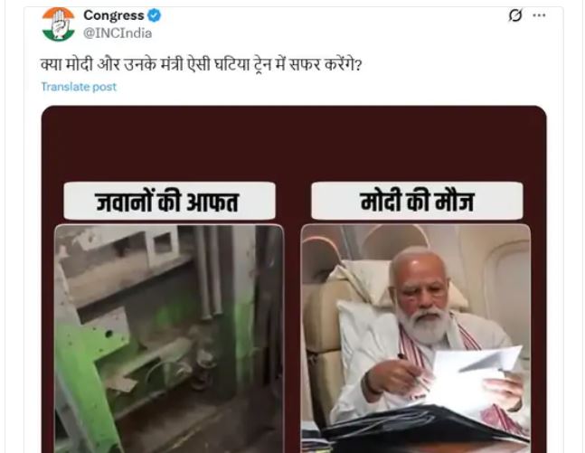 ਬੀਐਸਐਫ਼ ਜਵਾਨਾਂ ਨਾਲ ਵਾਪਰੀ ਇਸ ਘਟਨਾ ਨੂੰ ਲੈ ਕੇ ਕਾਂਗਰਸ ਕੇਂਦਰ ਸਰਕਾਰ ‘ਤੇ ਹਮਲਾਵਰ ਹੋ ਗਈ ਹੈ। ਕਾਂਗਰਸ ਨੇ ਸੋਸ਼ਲ ਮੀਡੀਆਂ ਤੇ ਇਕ ਤਸਵੀਰ ਸਾਂਝੀ ਕਰਦਿਆਂ ਸਵਾਲ ਕੀਤਾ – ਕੀ ਮੋਦੀ ਇੰਨੀ ਮਾੜੀ ਗੁਣਵੱਤਾ ਵਾਲੀ ਰੇਲਗੱਡੀ ਵਿੱਚ ਯਾਤਰਾ ਕਰਨਗੇ?